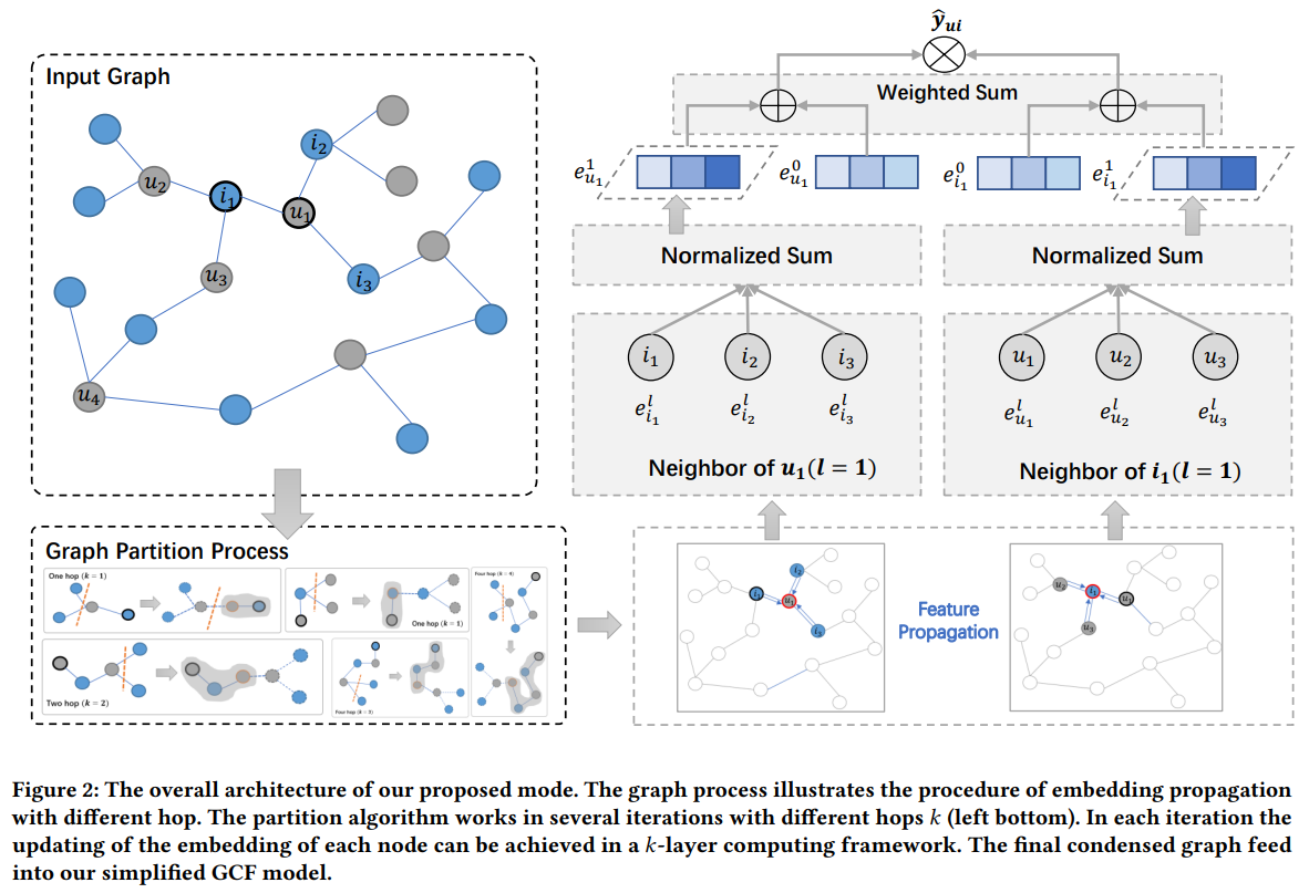 본 연구에서는 위 문제를 완화하기 위해 GCN 기법 안에 Feature Transformation과 Nonlinear activation의 필요성과 GCN 기반 추천 시스템의 속도 향상을 다룬다. 이를 위해 GCN Layer 간의 비선형 함수를 제거하고 Resulting Function을 단일 선형 변환으로 축소하여 과도한 복잡성을 감소시킨다. 구체적으로, Large Graph에서 다층 노드 정보를 효율적으로 학습하고 반영하기 위해 Graph Partition-based Algorithm을 고안하였다. (Figure 1)