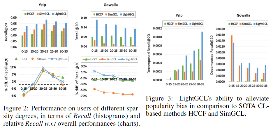 Figure 2, 3의 경우는 Popular Bias와 Data Sparsity에 대한 그림이다. X축은 Data Sparsity에 대한 값이며 Interaction의 수가 15 미만인 경우(0 - 15)에 Gowalla 데이터에서 성능이 가장 우수한 것을 확인할 수 있다. 본 연구에서 제안하는 LightGCL 기법의 성능이 우수한 것을 보여준다.