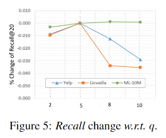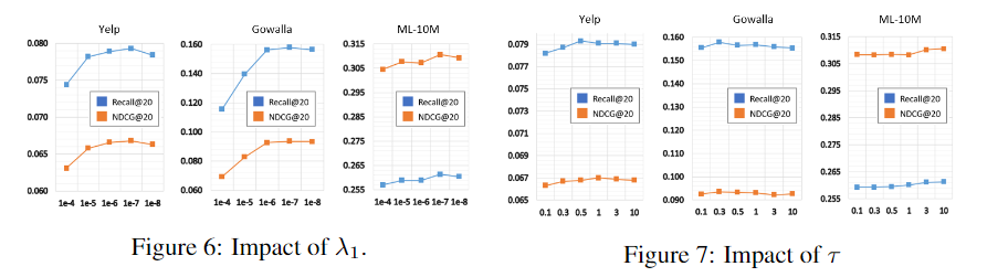 본 연구에서는 InfoNCE Loss $\lambda_1$, Temperature $\tau$, Rank of SVD $q$를 하이퍼파라미터로 사용한다. RQ5)에서는 각 하이퍼파라미터를 달리 설정하여 성능 차이가 존재하는지 확인하고자 한다.