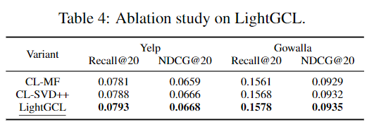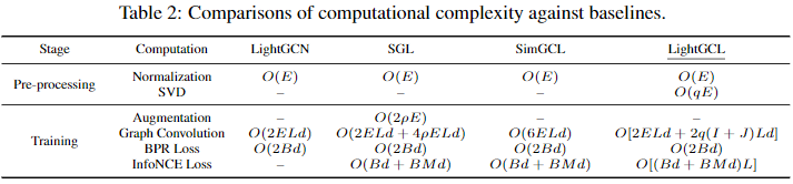 본 연구에서는 기존 연구와는 달리 두 가지의 새로운 View를 생성하는 것이 아니라, SVD를 통해 하나의 View만 생성하여 Contrastive Learning을 진행한다. 그렇기 때문에 Contrastive Learning을 사용하지 않는 LightGCN에 비해 시간 복잡도는 높게 측정되지만, SGL, SimGCL 등과 같은 Contrastive Learning에 비해서는 많이 줄어든 것을 확인할 수 있다. 그러나, SVD의 사용자 행렬, 제품 행렬, 대각 행렬에 대한 값을 저장하여야 한다는 단점이 있다.