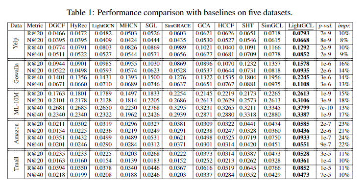 Contrastive Learning을 사용하는 모델이 사용하지 않는 모델보다 우수한 성능을 보이는 것을 확인할 수 있으며, Contrastive Learning을 사용하는 기법 중에서도 본 연구에서 제안하는 LightGCL의 성능이 가장 우수한 것을 확인할 수 있다. p-value를 통해서 통계적으로도 유의미하게 성능이 향상되었다는 것을 판단할 수 있다.