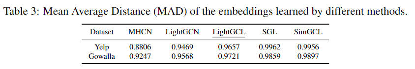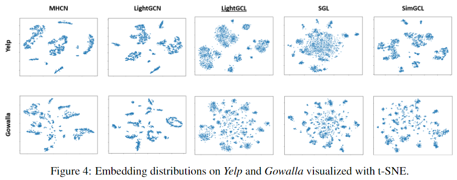 Contrastive Learning이 아닌 기법인 MHCN, LightGCN의 경우 Over-Smoothing 현상이 발생해 노드 임베딩이 대부분 뭉쳐있는 현상을 띄고 있다. 반면에, Contrastive Learning을 사용하는 기법의 경우 1) Over-Uniform 되어 Collaborative Relation을 제대로 파악하지 못하고 2) Clustering된 부분이 너무 작은 Cluster로 구성되어 있으며, Cluster 내부에서는 심한 Over-smoothing 현상이 발생한다.