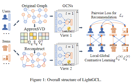 LightGCL 기법의 구조는 Figure.1에서 확인할 수 있다. 그림의 윗 부분은 Local Graph Dependency를 추출하고, SVD를 이용한 방법에서는 Global Collaborative relation을 분석하여 대조 학습의 성능을 향상시킨다.