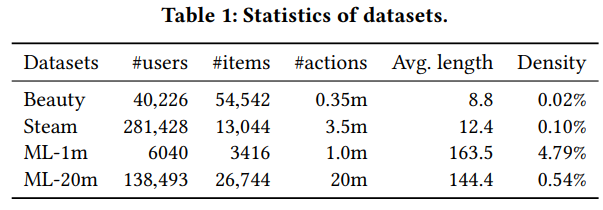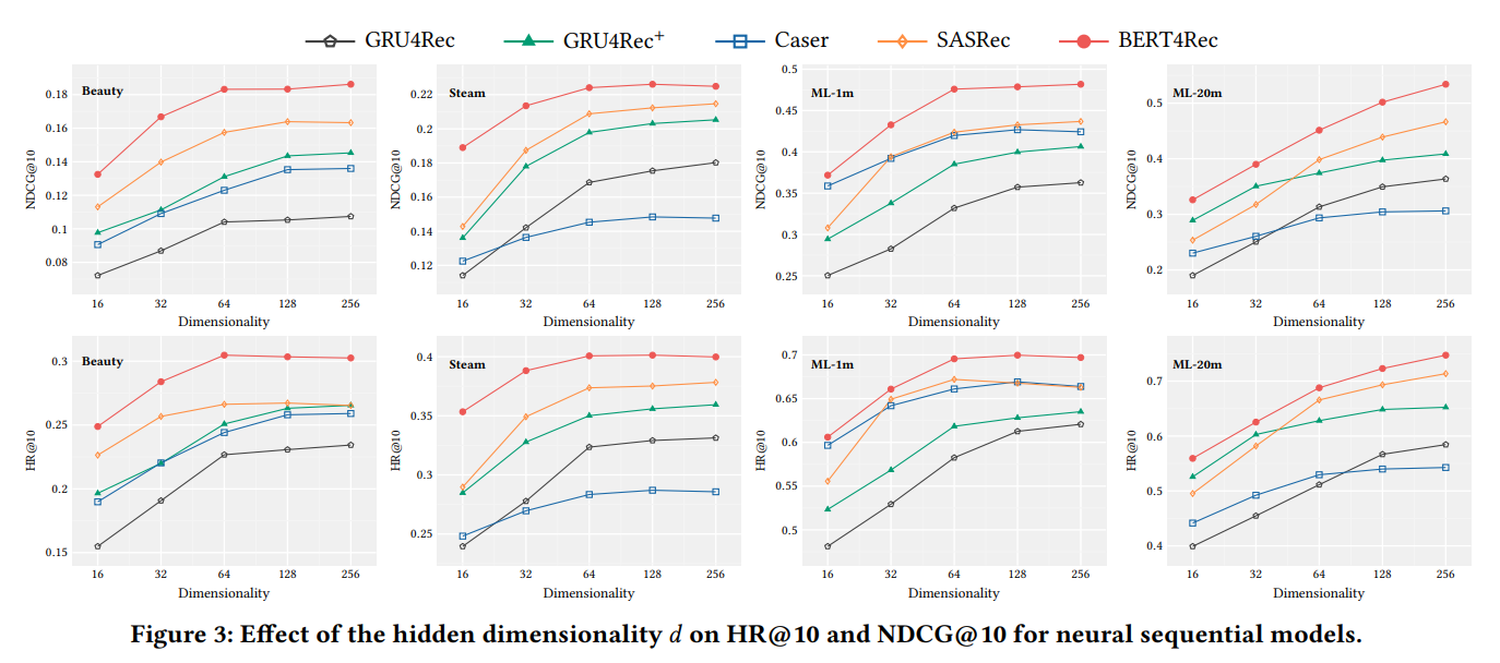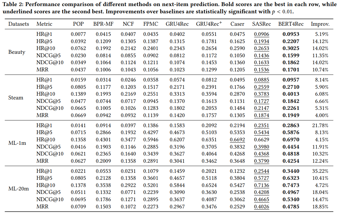 본 연구에서는 Beauty, Steam, MovieLens 데이터를 사용하여 실험하였으며, POP(Best Seller), BPR-MF, NCF, FPMC, GRU4Rec, GRU4Rec+, Caser, SASRec을 Baseline 모델로 사용하였다. 실험 결과는 당연하게 BERT4Rec의 성능이 가장 우수한 것을 확인할 수 있다.