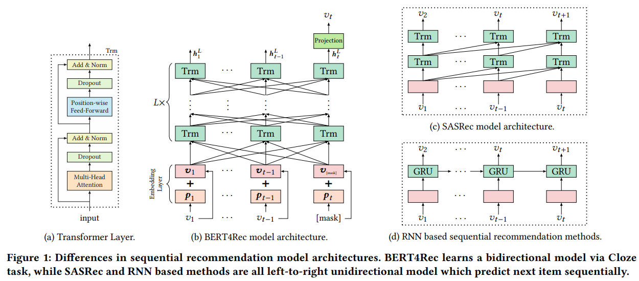 기존 Sequence 데이터를 다루는 추천 시스템 연구에서는 주로 Recurrent Neural Network (RNN) 과 같은 기법을 사용하여 Encoding한다. 그러나 RNN 기법은 왼쪽에서 오른쪽으로, 즉, 입력으로 들어오는 제품의 순서만을 고려하기 때문에 left-to-right 방식(Undirectional)은 사용자의 표현(Representation)을 제대로 학습하는 것이 어렵다. 구체적으로, left-to-right 방식은 오로지 이전 제품에 대한 정보만을 고려하기 때문에 Sequence에 잠재된 정보를 제대로 파악하지 못한다. 뿐만 아니라 실제 Sequence에는 노이즈가 있을 수 있는데, 이전 클릭 혹은 구매한 제품에 기반하여 다음 클릭 혹은 구매할 제품을 예측하고 있다.