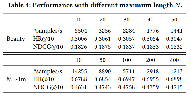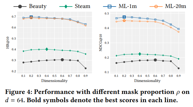 $d$의 경우 64인 경우에 가장 우수한 성능을 보이는 경우도 있고, MovieLes의 경우에는 차원의 크기가 커지면 커질수록 성능이 증가하는 추세를 보이고 있다. Mask Proportion $\pho$의 경우에는 데이터의 구성에 따라 0.2, 0.4, 0.6 등 다양한 결과가 도출된다. Sequence Length $N$의 경우에도 마찬가지로 데이터 셋의 구성에 따라 최적의 길이가 달라진다.