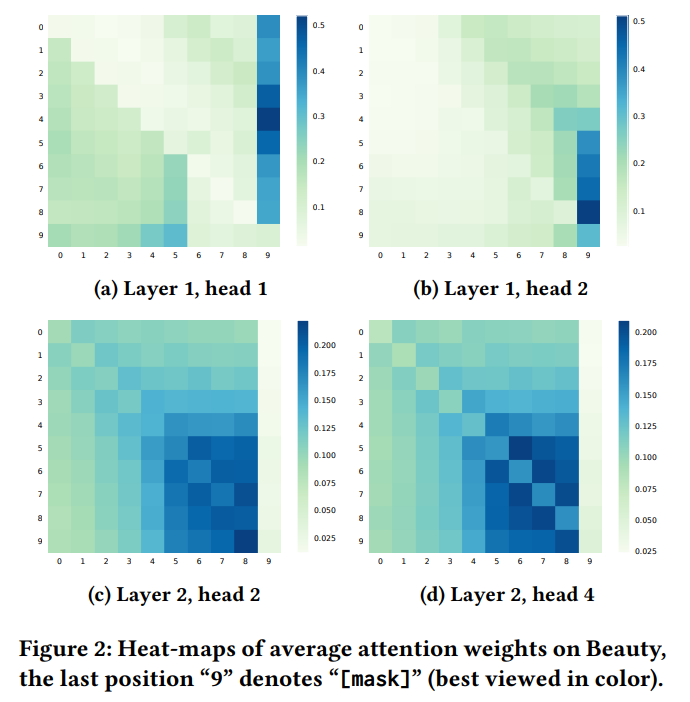 RQ1을 통해 Bidirectional 기법이 성능이 우수한 것을 확인하였다. 그렇다면 왜 Bidirectional 기법의 성능이 우수한 것일까? 아래의 그림에서 Layer1을 살펴보면 Head1의 경우 왼쪽 부분에 Attention을 하는 경향이 있고, Head2의 경우에는 오른쪽에 있은 Item에 Attention을 하는 경향이 있다. 또한, Layer2의 경우에는 근처의 Item에 Attention하는 경향을 보인다. BERT2Rec의 경우 Layer=2로 지정하였기 때문에 Layer2는 출력 층과 연결되어 있기 때문에 최근 항목의 다음 항목을 예측하는 데 더 중요한 역할을 하기 때문이다. Bidirectional 기법을 사용하지 않는다면, Layer1에서의 결과를 파악할 수 없기 때문에 Bidirectional 기법의 성능이 우수한 것으로 확인된다.