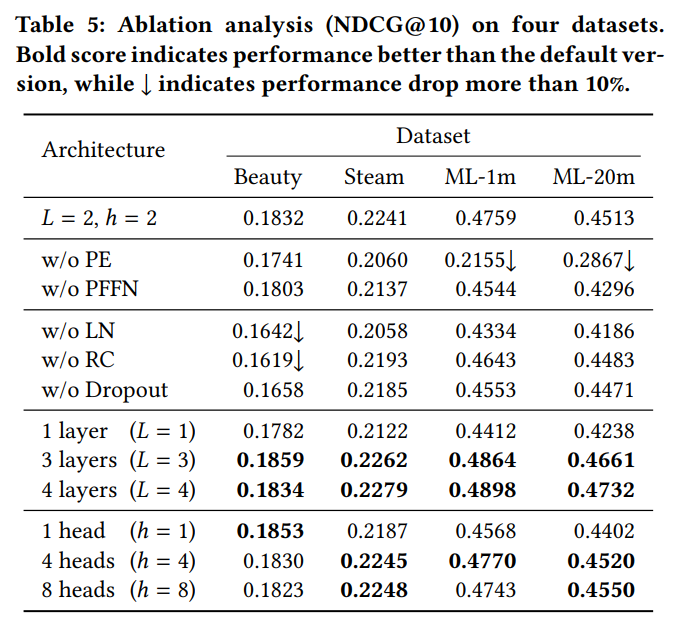 Ablation Study에서는 Position Embedding (PE), Position-wise Feed Forward Network (PFFN), Layer Normalization (LN), Residual Connection (RC), Dropout, Layer Number $L$, Head Number $h$의 영향을 확인하기 위한 실험을 진행하였다.