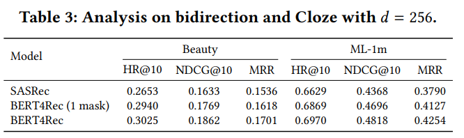 SASRec의 경우 BERT4Rec 구조에서 Bidirectional이 아니라 left-to-right 모델이다. 실험 결과를 통해 Bidirectional 구조가 left-to-right 모델보다 우수한 것을 확인하였고, Masking을 하나만 했을 때와 $\rho$로 지정해 더 많은 Masking을 했을 때 성능이 우수한 것을 확인할 수 있다.