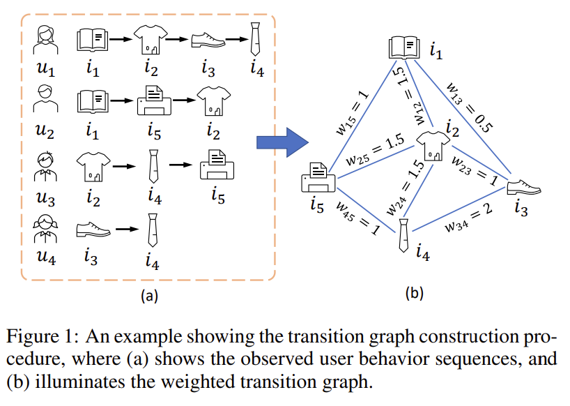 사용자는 $u \in U$, 제품은 $v \in V$, Interaction Sequence의 집합은 $D$, Interaction Sequence는 $S = \{v_1, v_2, \cdots, v_n\}$로 표기한다. $n$는 Interaction안에 존재하는 제품의 총 길이를 의미한다. 사용자 $u$에 대한 Embedding Vector는 $p_u \in \mathbb{R}^{1 \times d}$로 표기하고, 제품 $i$의 Embedding Vector는 $e_i \in \mathbb{R}^{1 \times d}$, t 시점의 $S$의 initial Embedding은 $E^{(0)}_S \in \mathbb{R}^{n \times d} $로 표기한다. 모든 제품에 대한 Embedding은 $E \in \mathbb{R}^{|V| \times d}$로 표현할 수 있다.