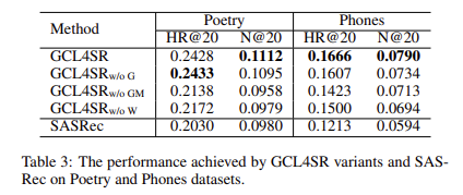 Performance Comparison은 기존의 SoTA 모델과 성능을 비교했을 때 어떤 성과를 보이는지 (Table 2)를 다루고 있고, Ablation Study는 본 연구에서 제안하는 GCL4SR 기법의 구성요소 즉, Graph Contrastive Loss, MMD, edge Weight 등의 요소를 제거했을 때 성능 차이가 있는지를 기술한다. Sensitivity Study는 본 연구의 Hyper-parameter를 달리 설정했을 때 성능의 변화가 있는지를 실험한 것이며, 마지막 Impact of Sequence Encoder는 다양한 Sequence Encoder를 사용했을 때 성능 차이가 존재하는지 확인하는 실험이다. 본 연구에서는 SASRec, GRU, HGN을 사용하여 성능을 비교하였으며, SASRec의 성능이 가장 우수한 것을 확인하고 이를 채택하여 사용하였다.