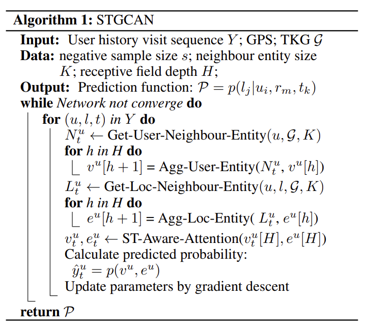 STGCAN 기법은 총 4 단계로 구성되어 있다. 1) Embedding Layer, 2) User Neighbour Aggregation Layer, 3) Location Neighbour Aggregation Layer, 4) Spatial-Temporal Interval Aware Attention Layer.