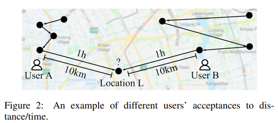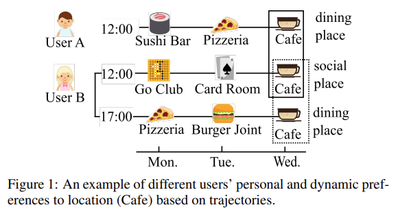 POI Recommendation은 사용자가 선호할 만한 장소를 추천하는 것에 초점을 두고 있다. 이는, Location-based Social Networks (LBSNs)에서 중요한 역할을 수행하고 있다. 본 연구에서는 real life에서 다음과 같은 것들을 확인하였다. 1) Personal Preference: 같은 장소라도, 개인의 선호에 따라 다른 장소로 간주할 수 있다. Figure 1을 살펴보면 User A는 카페를 Dining Place로 이용하고 있으나, User B는 12:00시에 Social Place로 이용하였다. 2) Dynamic preference: 같은 장소라도 시간에 따라 다른 장소로 간주될 수 있다. User B는 12:00시에는 카페를 Social Place로 사용하였으나, 17:00시에는 Dining Place로 사용하였다. 3) Personal acceptance to distance/time: Figure 3을 보면 Location $L$은 User B가 User A에 비해 방문할 확률이 높다. User B와 User A의 이동 궤도(Trajectory)를 살펴보면 User B는 보다 먼 지역도 자주 다녀온 것을 확인할 수있고, User A 는 비교적 본인의 위치에서 가까운 장소를 많이 방문하는 궤도를 보이고 있기 때문이다.