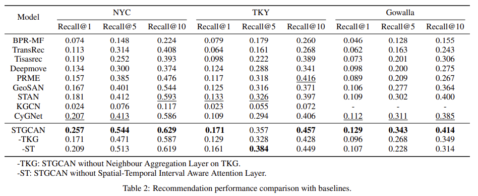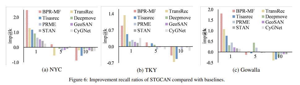 본 연구에서는 NYC, TKY, Gowalla와 같은 POI Recommendation Task에서 주로 사용하는 데이터를 통해 실험을 진행하였으며, BPR-MF, PRME, TransRec, DeepMove, KGCN, TiSASRec, GeoSAN, STAN, CyGNet 등과 같은 POI Recommendation을 위한 SoTA 모델을 베이스라인으로 사용하였다. 실험에서 특이한 점은 $Imp@K$라는 Metric을 새로 정의하여 사용하였으며, 이는 STGCAN 의 Recall에서 베이스 라인의 Recall 값을 뺀 후 정규화한 값을 의미하고 아래의 수식과 같이 계산된다.