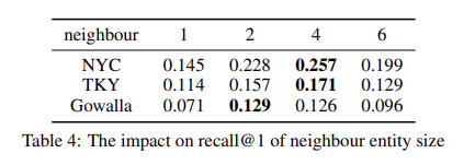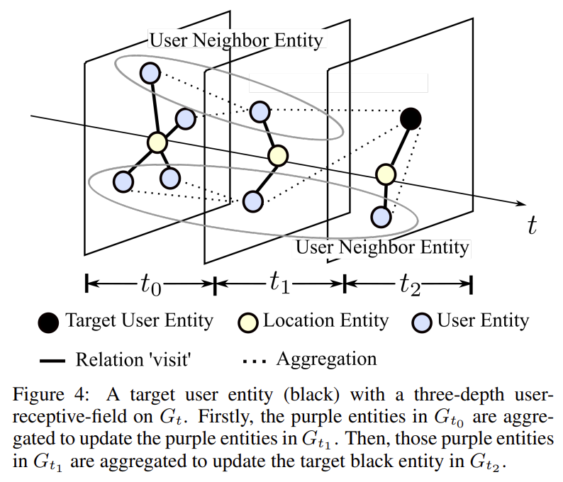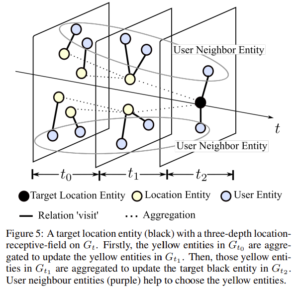 이번 단계는 Neighbour 정보를 Aggregation해서 Embedding을 업데이트하는 단계다. 본 연구에서는 TKG 를 사용하기 때문에 Triple이 아닌 Quadruple $(e_u, r, e_l, t)$ in $\mathcal{G}$로 구성된다. 이때 $e_u$의 Neighbour Entitiy는 $t$시점 이전에 같은 Location을 방문한 $e_{u^{\prime}}$으로 정의한다. $(e_{u^{\prime}}, r, e_l, t^{\prime} ) ( t^{\prime} < t) $. 본 연구에서는 $K$ 개의 이웃을 선택하여 이를 구축한다. 그렇다면 Neighbour Entity는 $N^u_t = \{ e^{u^{\prime}, 1}_t, e^{u^{\prime}, 2}_t, \cdots, e^{u^{\prime}, K}_t \} $가 된다. (Figure 4 참고)
