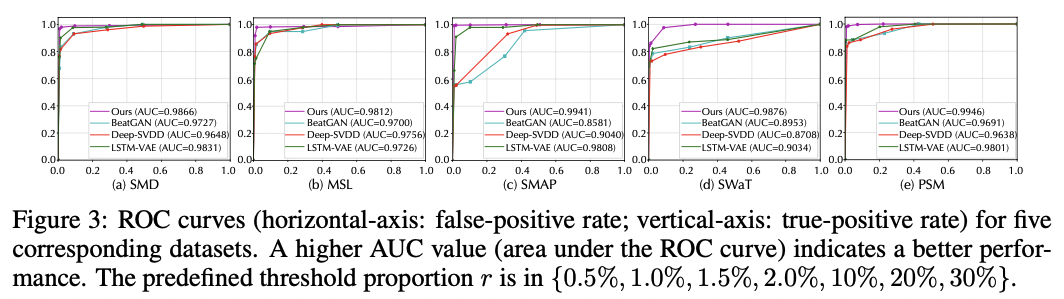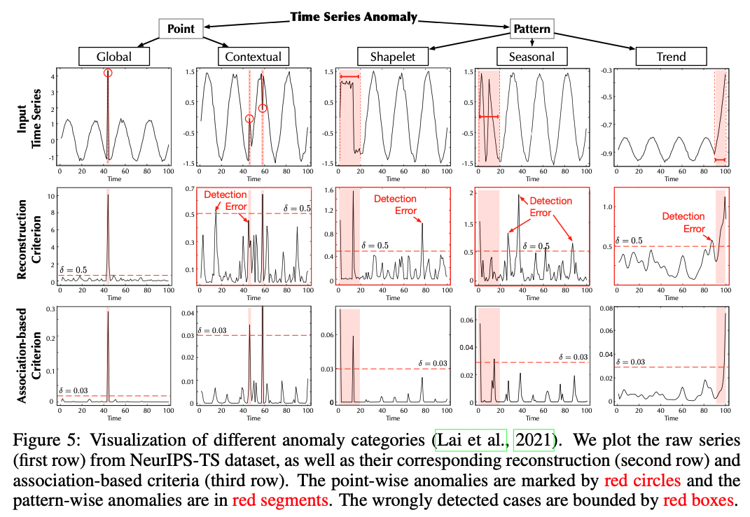 Figure 5에서는 Point, Pattern Anomaly가 존재할 때 Reconstruction Criterion와 Association-based Criterion을 비교 분석한 결과다. Reconstruction Criterion 만을 사용했을 때 Global Point Anomaly에 대해서는 제대로 파악할 수 있으나, Contextual Point Anomaly에 대해서는 제대로 찾아내는 것이 어려운 것을 확인할 수 있고, Pattern Anomaly에 대해서는 대부분의 경우에 Detection Error가 발생하는 것을 확인할 수 있다.