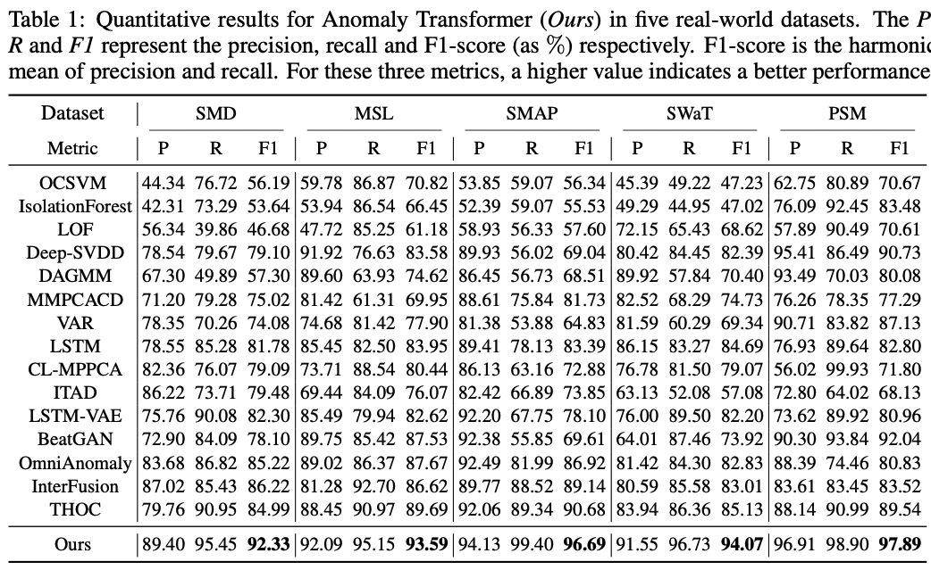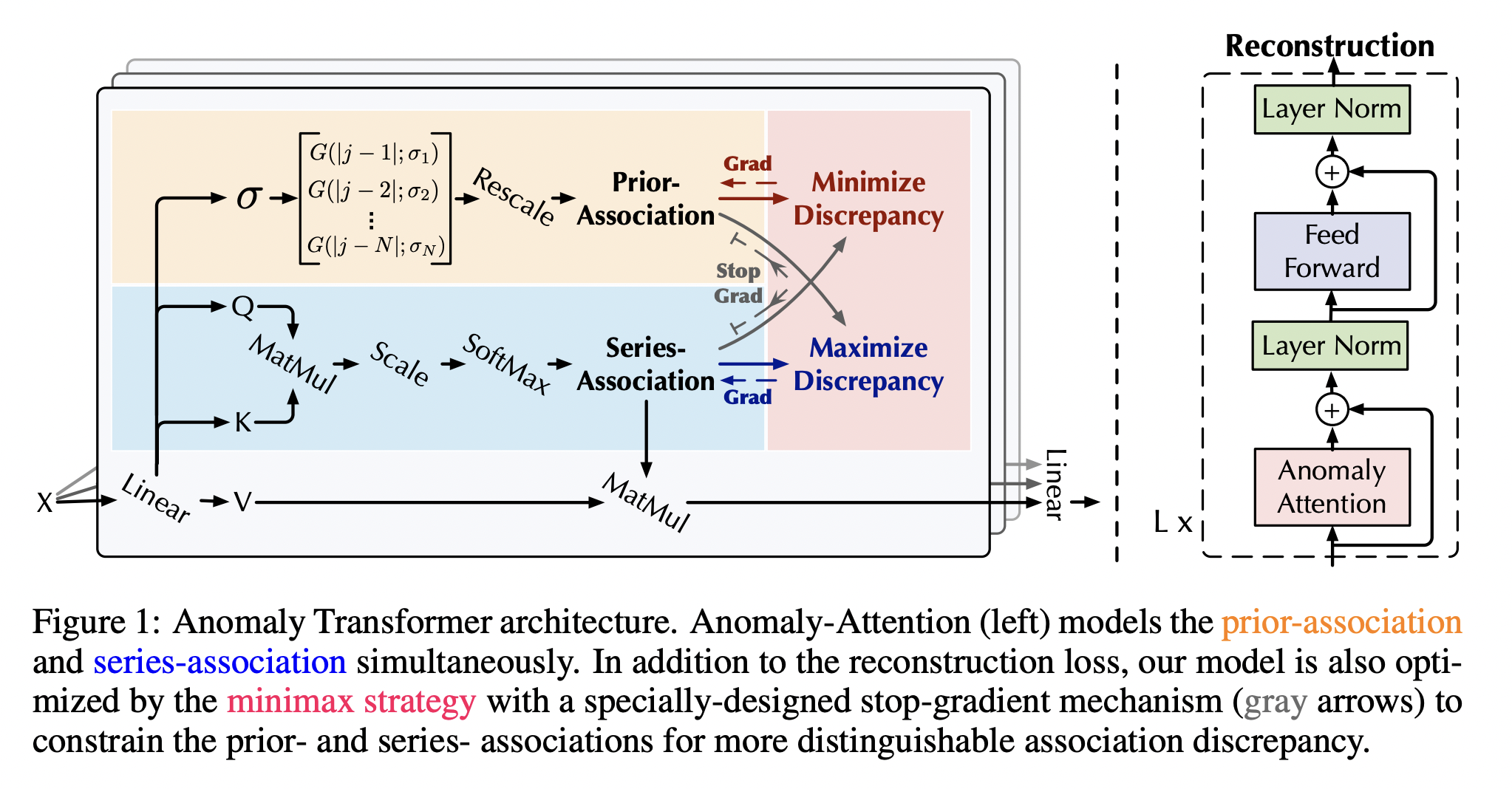 본 논문은 이상치 탐지(Anomaly Detection)를 위해 Prior Association과 Series Association 간의 차이 즉, Association Discrepancy를 이용한 Transformer 기반 모델 Anomaly Transformer를 제안하였다. 최적화를 위해 Minimax 방식을 사용하였으며, 기존 이상치 탐지 기법에 비해 월등히 높은 성능을 보이는 것을 확인하였다.