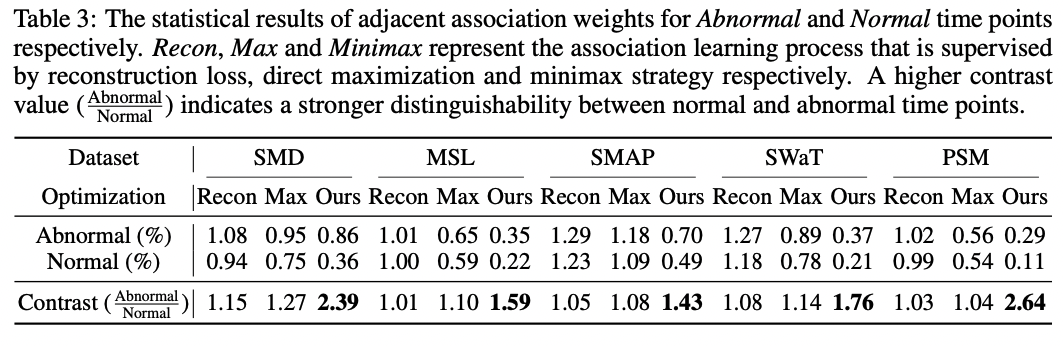 마지막은 최적화 전략에 대한 분석이다. Contrast Value는 정상과 비정상 간의 차이를 의미하며, 값이 높을수록 더 잘 구분하는 것을 의미한다. Minimax 방식을 사용한 경우 Reconstruction, Max 방식에 비해 높은 것을 확인할 수 있다.