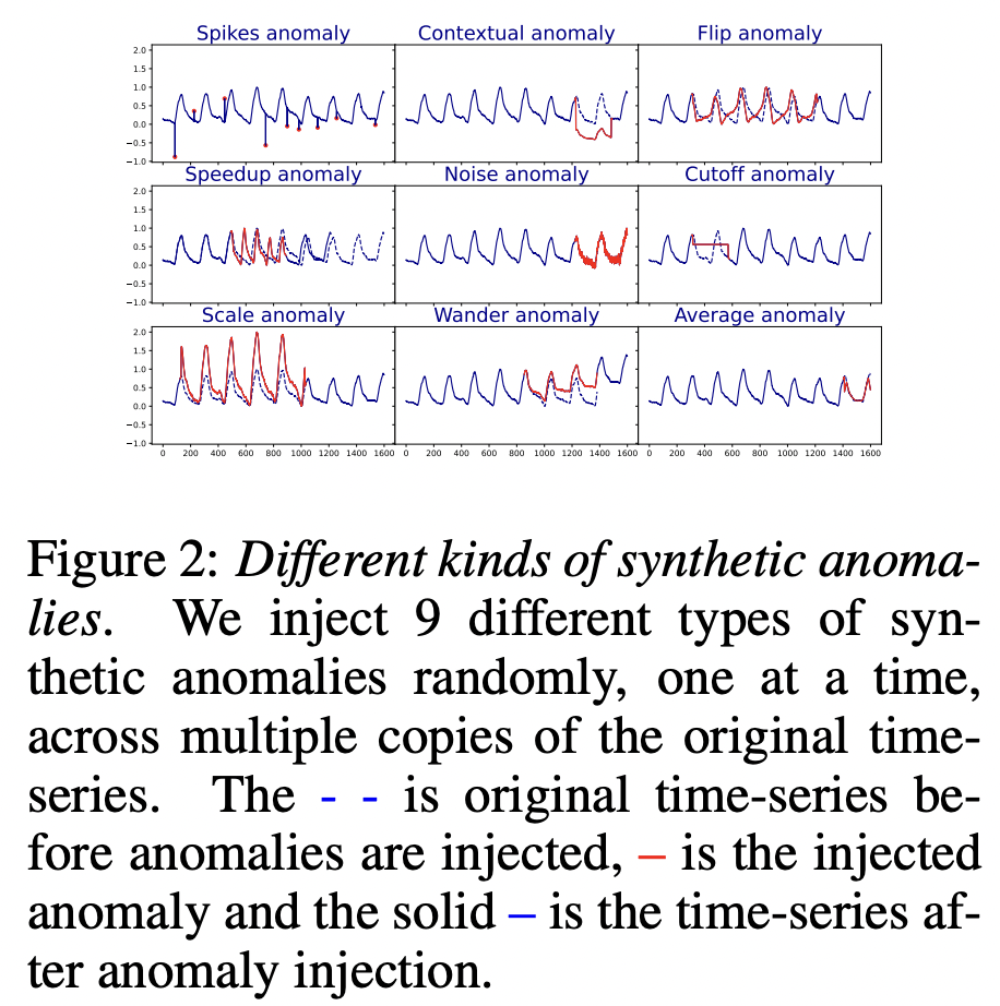 좋은 이상 탐지 모델은 실제 이상치가 들어왔을 때 이를 잘 구분할 것이다. 이를 기반으로 본 연구에서는 Spikes, Contextual, Flip, Speedup, Noise, Cutoff, Scale, Wander, Average Anomaly를 주입하여 모델을 학습한다. 이때 이상치에는 (pseudo-)positive label을 부여하고, 나머지 값에는 (pseudo-)negative label을 부여하고 F1-Score를 측정한다. 그러나, 이와 같은 방식은 두 가지 문제점이 존재한다. 첫 번째, 실제 이상치가 들어올 때 9개의 Synthetic Anomaly 유형과 다른 유형이 들어올 수 있다. 두 번째, Synthetic Anomaly로 생성한 데이터와 같은 유형의 데이터가 이미 정상 데이터 내에 존재해서 Negtive label이 부여될 수 있기 때문에 이런 경우 성능이 저하될 수 있다.