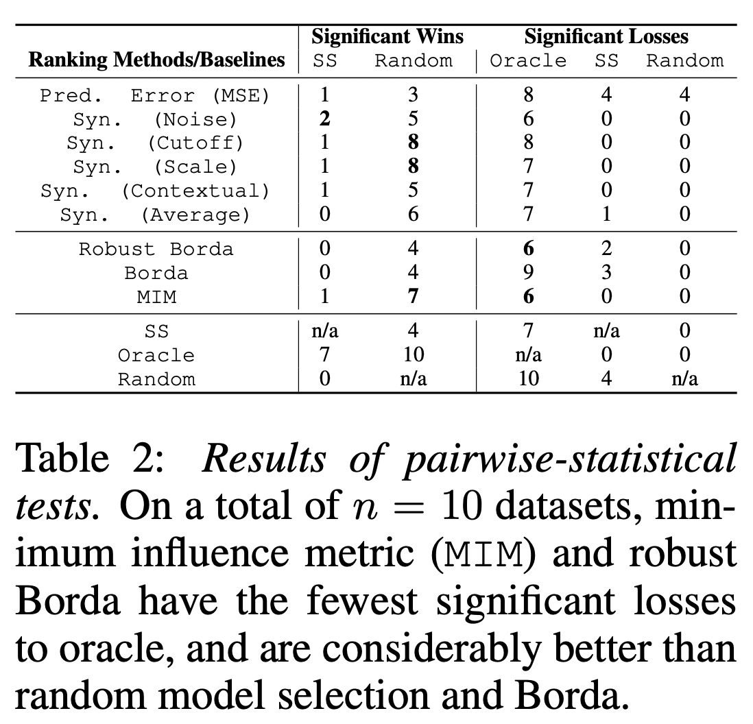 $\text{Borda}$는 1784년 제안된 기법으로, 각각의 평가 지표에 대해 순위 정보를 받고, 순위를 내림차순으로 정렬한 후 랭킹에 대한 가중치를 계산한다. 예를 들어, 총 N개의 모델 중에서 r 번째 순위를 할당 받는다면, (N-r)의 값을 할당하는 것이다. $\text{EI}$는 Empirical Influence Function을 의미한다.