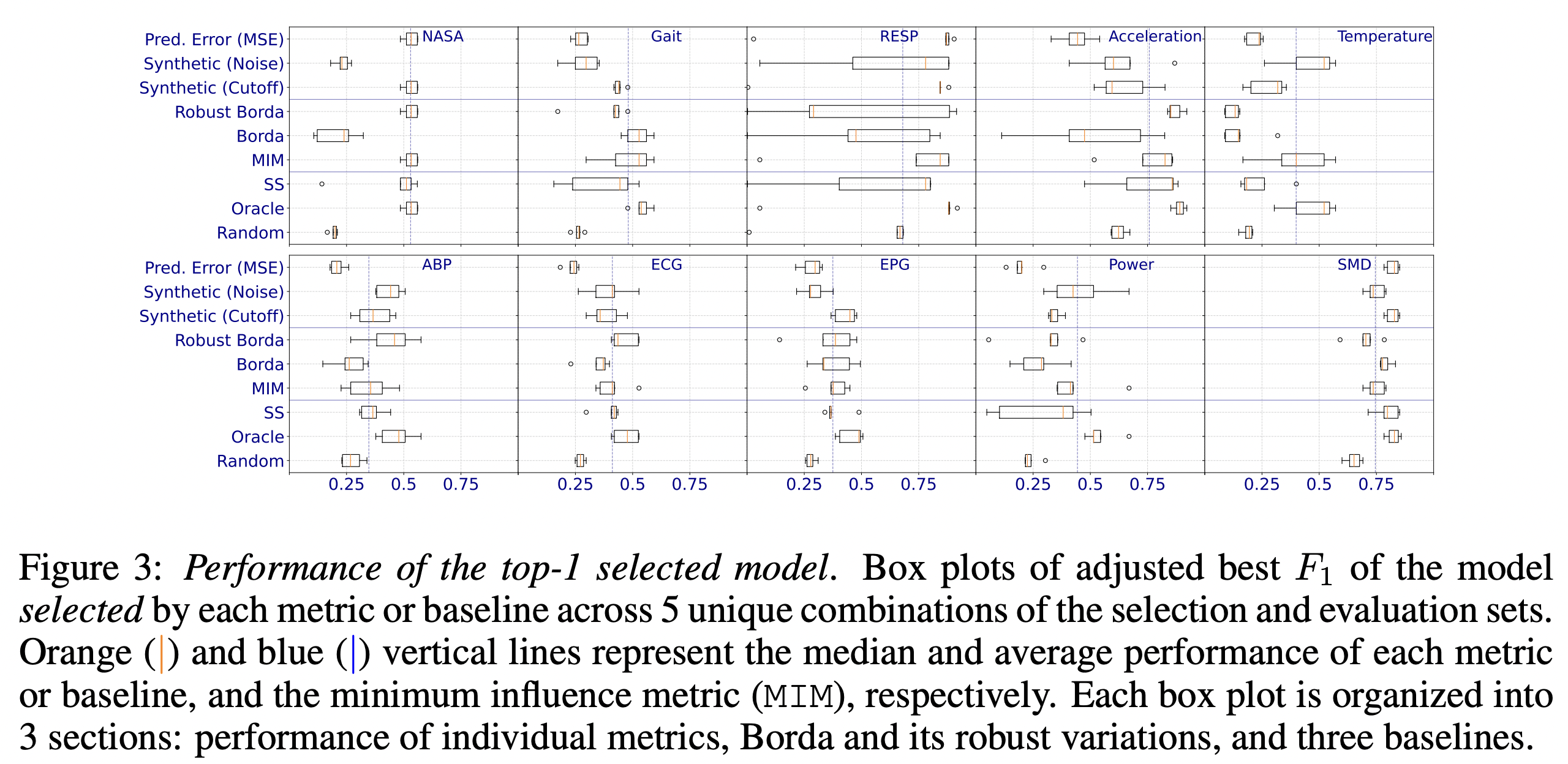 먼저, 첫 번째 실험 결과는 Figure 3과 같이 어느 하나의 평가 지표가 월등히 우수한 성능을 보이는 것이 없다. 라는 것을 의미한다. 만약, MSE 평가 지표가 모든 경우에 대해서 가장 우수한 모델을 선정한다면, 시계열 데이터를 다루는 모델 중 가장 좋은 모델을 선정할 때 MSE 만을 사용하면 된다. 그러나, 실험 결과에서 확인할 수 있듯, MSE가 가장 우수한 모델을 찾는 경우도 있고, 아닌 경우도 있기 때문에 적절한 방법을 통해서 선정하는 것이 옳다라는 본 연구의 주장을 뒷받침한다. 두 번째 실험 결과는 Minimum Influence Metric (MIM) 도 베이스라인 (SS) 보다 그렇게 나쁘지 않은 결과를 보이고 있으며, Temperature 데이터에서는 오히려 좋은 성능을 보인다는 것을 확인한 실험이다 이때 MIM는 RRA에서 소개한 Robust Borda와 Borda 중 낮은 스코어만 선택하는 방식을 의미한다. 세 번째 실험 결과는 Robust Borda의 영향에 대한 실험 결과를 나타낸다. 네 번째 실험 결과는 Oracle 보다 Robust Borda의 Loss가 더 낮다는 것을 기술한다 (Table 2). 다섯 번째 실험 결과는 Synthetic anomaly injection metrics가 Prediction Error, Centrality metrics와 같은 다른 평가 지표보다 우수하다는 것을 보인다는 것이다. 여섯 번째 실험 결과는 시계열 데이터 특성에 맞는 Synthetic 데이터를 주입했을 때 좋은 성능을 도출할 수 있다는 해석이다. 예를 들어, 속도가 빨라지거나 느려지는 등의 데이터를 입력한 경우 호흡과 관련된 데이터에서 더 좋은 성능을 발휘할 것이다.