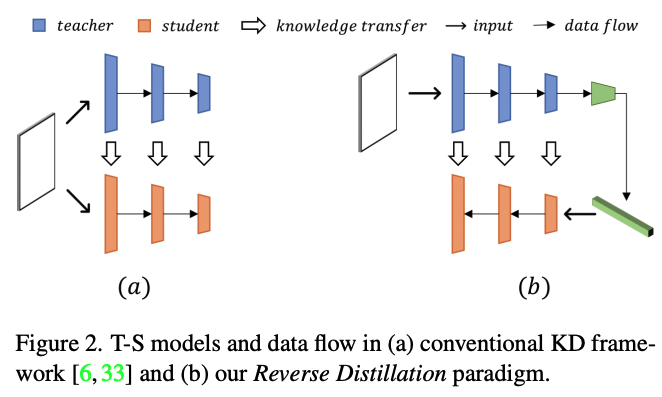 전통적인 Knowledge Distillation 모델은 Student 모델을 Teacher 모델과 유사하거나 같은 모델로 사용한다. 이때 학습되지 않은 이상치에 대한 One-Class distillation 맥락에서 Student 모델은 Teacher와 매우 다른 표현을 생성한다는 것을 가정으로 한다. 그러나, 가끔씩 이상치와 차이가 감소하는, 즉, 이상치라고 분류하지 못하는 경우가 발생하는데, 본 논문에서는 이를 해결하고자 다른 Data Flow를 가지는 구조인 Reverse Distillation 방법을 제안하였다.