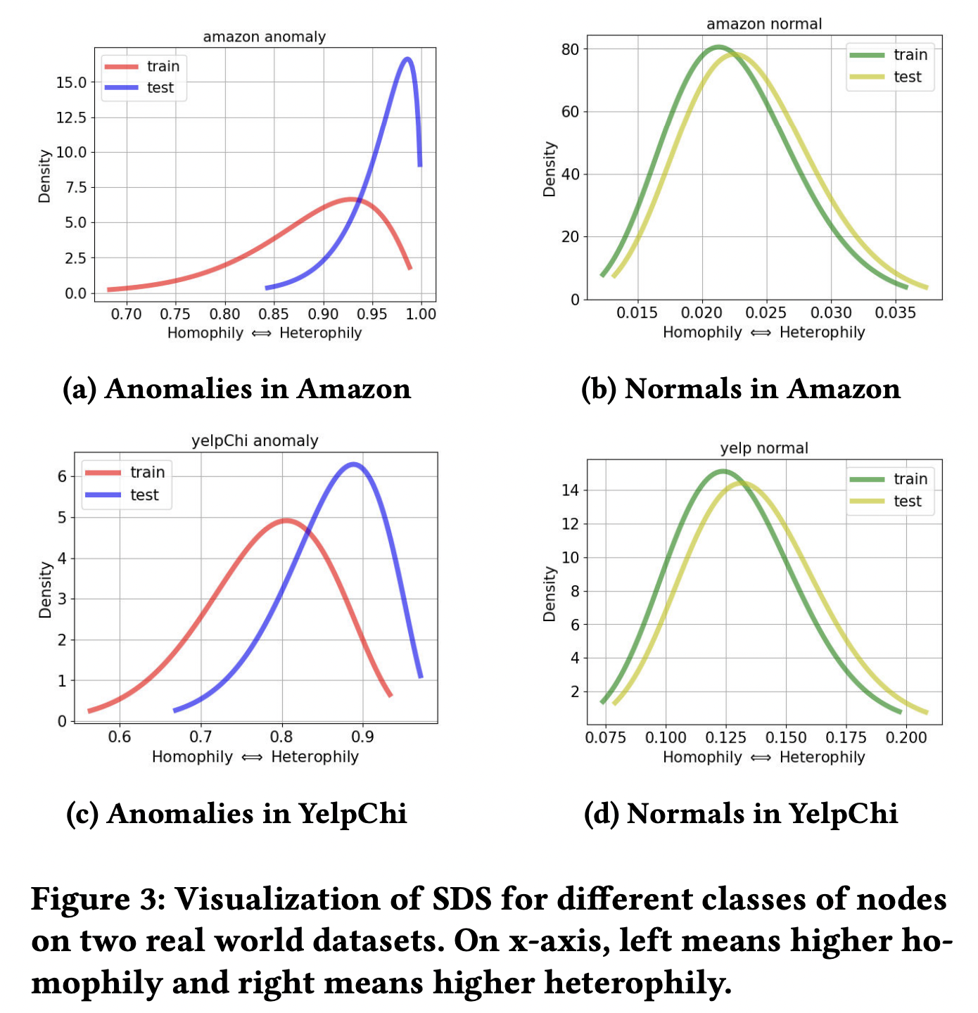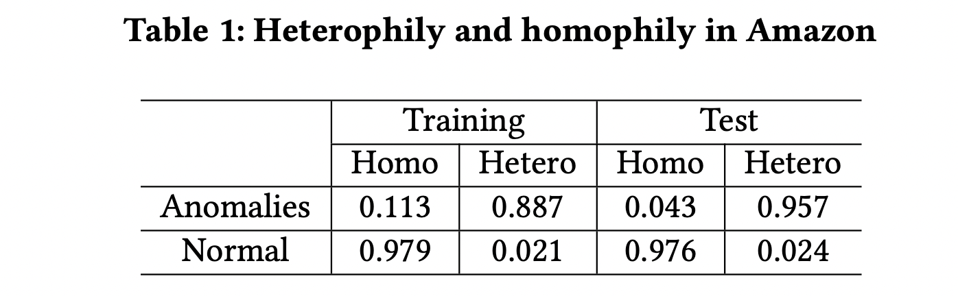 Graph Anomaly Detection (GAD)에서는 이질성(Heterophily)과 동질성(Homophily)이라는 구조적 분포를 가지고 있다. 이질성이 높을수록 그래프 내 노드의 이웃들이 다른 라벨을 가지는 노드들로 구성되어 있다는 것을 의미하고, 동질성이 높을수록 노드와 이웃 노드들이 서로 같은 라벨을 가진다는 것을 의미한다. [Figure 1 참조]