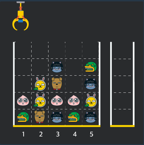 크레인 인형뽑기 게임 문제는 2019 카카오 개발자 겨울 인턴십에 나온 문제다. 크레인에서 인형을 뽑아 새로운 칸에 집어놓고 순서대로 일치되면 제거하고, 제거된 인형의 갯수를 출력하는 문제다