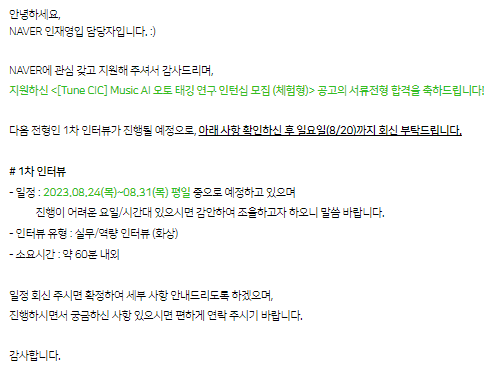 네이버 Turn CIC에서 Music AI 오토 태깅 관련 체험형 인턴 모집에 지원했다. 서류 합격 발표는 일주일 정도 걸렸던 것 같고, 서류에 있었던 논문 내용을 기점으로 면접에서 기술하는 형태로 진행하였다. 모집 요강을 살펴보면, 쿠버네티스 관련 지식, SQL 지식, 딥러닝 지식, 콘텐츠 기반 지식이 있어야 가능한 것으로 보인다.