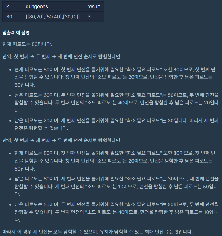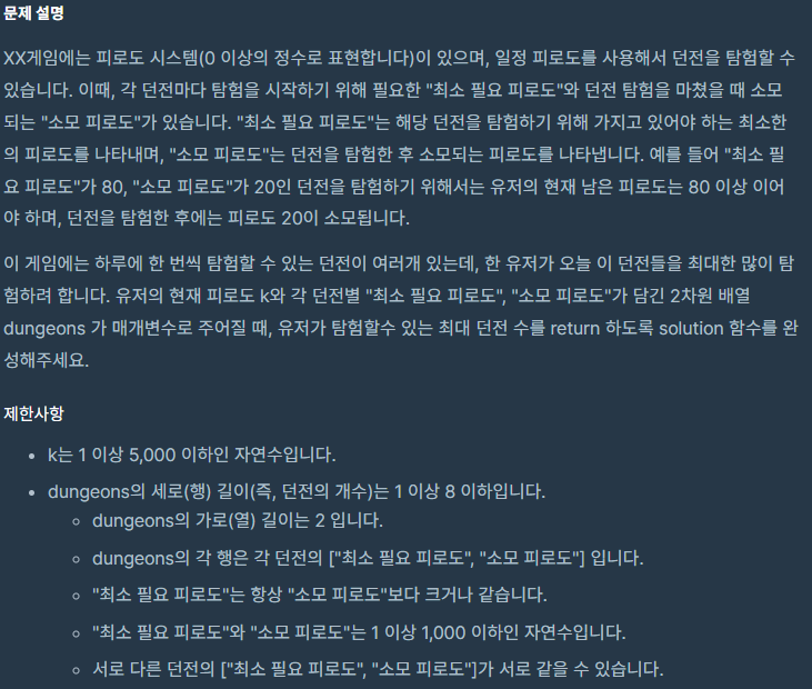 def solution(k, dungeons):