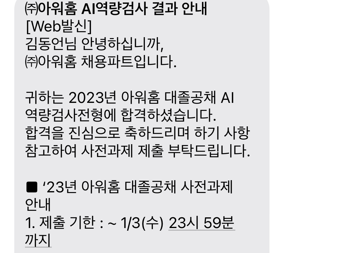입사 지원 -> AI 역량 검사 -> 사전 과제 -> 실무/PT 면접 -> 임원 면접 -> 최종 입사 형태로 진행되며, 2월 말 정도에 입사하는 것으로 전달 받았다.