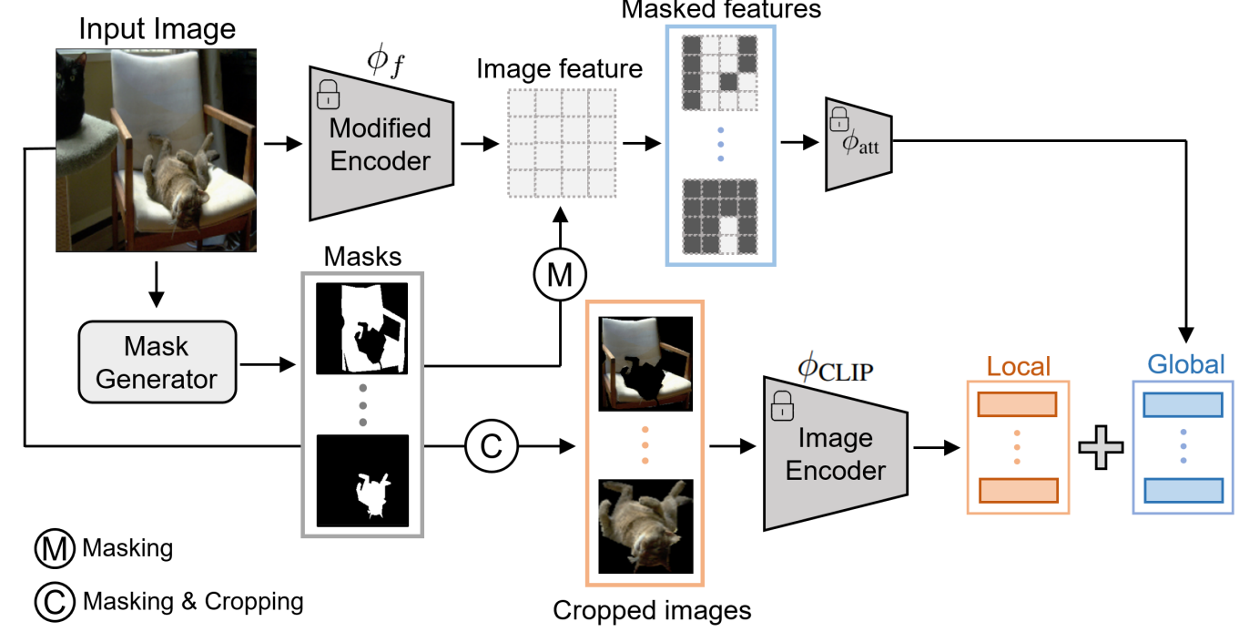 $t$는 Global-local textual feature를 의미하고, $f$는 Mask-guided global-local visual feature를 의미한다. 이때, $M(I)$는 입력으로 주어진 이미지에 대한 Mask proposal set을 의미한다.