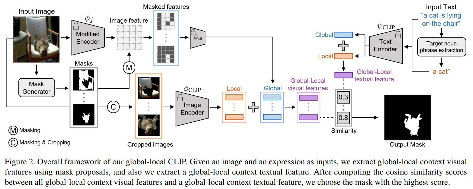 본 논문에서는 이와 같은 문제를 해결하고자, 사전 학습된 CLIP을 기반으로 한 Zero-shot referring image segmentation method를 제안한다. 입력으로 주어진 텍스트 정보에서 segmentation mask 를 추출하기 위해, 입력된 이미지의 Global and local contextual information을 추출하는 Mask-guided visual encoder 방법을 제안하였다. 뿐만 아니라, 입력된 텍스트 정보에서 문장 수준의 정보(Global)와 명사구 수준의 정보(Local)를 추출할 수 있는 Global-local text encoder를 제안한다.