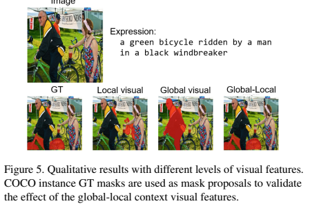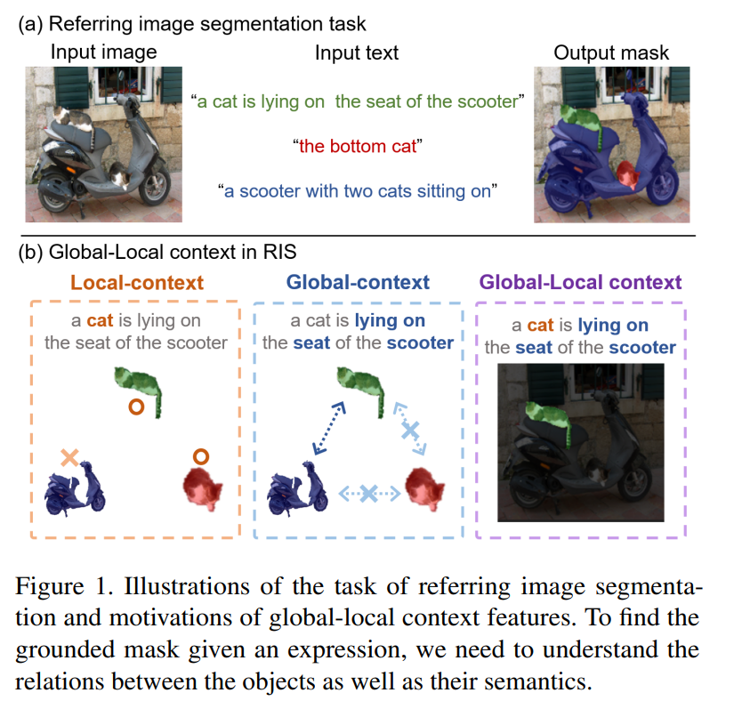 Figure 1을 예시로 살펴보면, 오토바이 위에 고양이 2마리가 있다. 이때 "a cat is lying on the seat of the scooter" 라는 Text 정보를 주었을 때, Local-context 에서는 "cat"이 선택되어 2마리의 고양이가 선택될 것이다. Global-context 에서는 "lying on", "seat", "scooter" 라는 정보를 받아, 실제 고양이가 어디에 위치해 있는지를 파악하여 최종적으로 Global-Local Context를 고려하면 초록색으로 Segmantation된 고양이가 선택되는 것이다.
