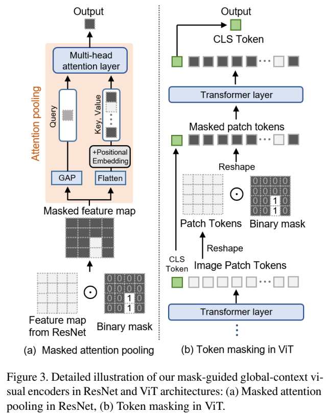 본 연구에서는 CLIP의 Backbone 모델로 ResNet과 ViT를 사용하였다 [Figure 3 참조]. ResNet의 경우 Masked attention pooling 형태로 수행하였고, ViT의 경우 Token 자체를 Masking하는 형태로 입력을 처리하였다.