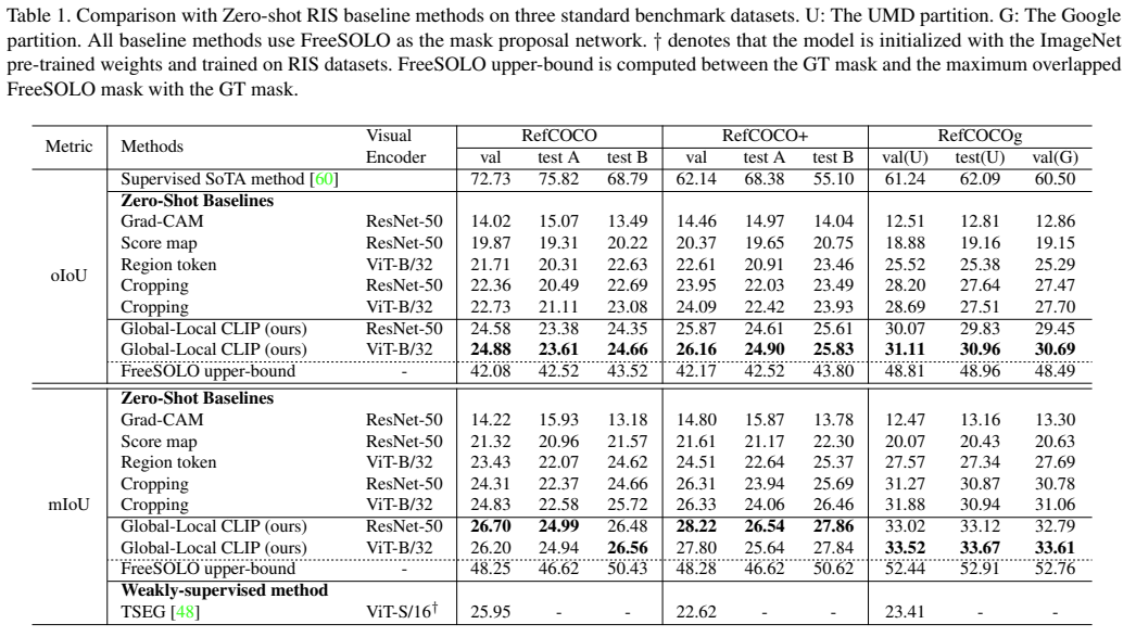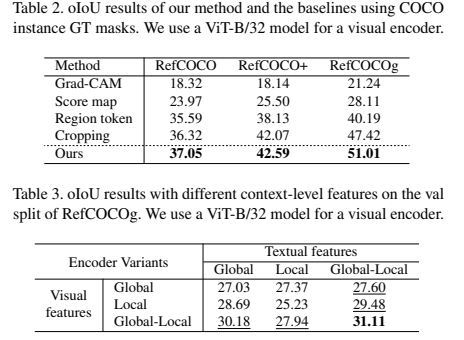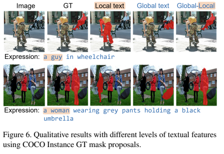 마지막 Ablation Study의 경우 Table 2 (Effect of Mask Quality), Table 3 (Effects of Global-Local Context Feature), Figure 5, 6 (Qualitative Analysis) 에서 확인할 수 있다. 본 연구에서 제안하는 방식의 Mask Quality가 더 우수한 것을 확인할 수 있다. Table 3을 확인하면, 이미지와 텍스트의 정보를 사용할 때 Local-Local < Local-Global < Global-Local < Global-Global 순서로 성능이 우수한 것을 확인할 수 있고, 이미지와 텍스트에 대해서 Globa-Local 정보를 모두 고려한 경우에 가장 우수한 성능을 보이는 것을 확인할 수 있다.