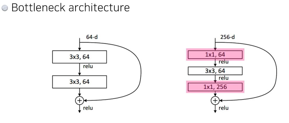 ResNet에서는 Bottlenect architecture가 들어간다. 여기도 GoogLeNet에서 1x1 convolution을 사용한 이유와 동일하게 parameter의 수를 줄이는 용도로 3x3 convolution을 하기 전에 1x1 convolution을 통해 parameter 수를 줄인다. 마지막에 256 을 통해 output 사이즈를 맞춰준다.