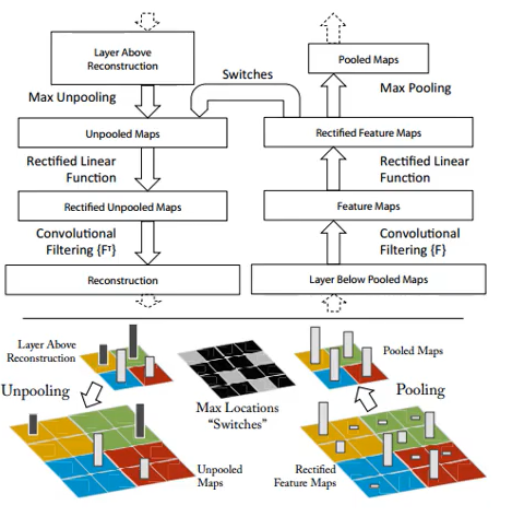ZFNet은 사실 AlexNet의 구조와 큰 차이가 없다. 실제로 AlexNet에 쓰였던 parameter를 살짝 손본 정도인데 성능이 향상되었다. parameter를 손본 기법에 대해서 알아보자. CNN를 잘 training하려면 intermediate layer에 그 filter들이 어떻게 학습되는지를 잘 봐야된다는 것이다. 실제로 filter를 학습하는 방법이 ZFNet이 나오기 전에는 없었다. 여기서 나온 방법이 Deconvnet이다. Rectified Feature Maps을 보면 max pooling을 할 때 값들이 Pooled Maps로 이동하게 된다. 이 값들이 ReLU를 적용한 다음 계속 위로 보내게 된다. 활성화된 픽셀(max pooling 된 값)의 위치를 기억해두고 똑같이 ReLU함수를 적용하여 unpooled하게 된다. 이런 과정을 통해서 Reconstruction을 하면 filter를 볼 수 있다는 것이다.