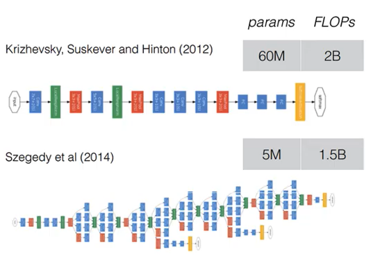 GoogLeNet은 위에서도 말했다시피 ILSVRC 2014 에서 우승한 모델이다. GoogLeNet과 AlexNet을 비교해보면 GoogLeNet이 depth가 더 깊기도 하고 width도 더 두꺼운데, parameter의 개수를 보면 어마어마하게 줄었다는 것을 볼 수 있다. GoogLeNet에서는 inception Module이 개념이 도입된다. filter 연산은 선형 연산인데 filter 연산을 비선형으로 연산을 하게되면 더 많은 정보를 찾을 수 있지 않을까 라는 컨셉에서 나온 모듈이 inception module이다. GoogLeNet을 보면 Network 구조 안에 Network 처럼 생긴 Layer가 존재한다. 이런 구조를 Network In Network(NIN) 구조라고 지칭한다.