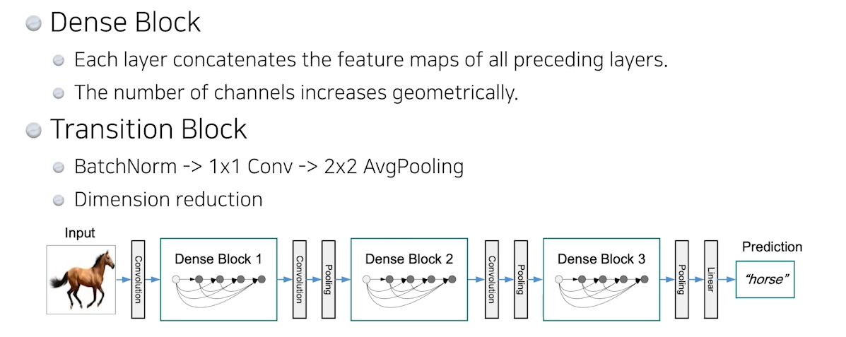 ResNet의 경우 마지막에 skip connection을 통해 convolution을 통해 나온 어떤 값을 더해주는데, DenseNet은 더하게 되면 두 개의 값이 섞여버리니 두 값들을 concatenation을 진행한다. 하지만 계속 이어붙이면 parameter수가 2, 4, 8, .. 기하급수적으로 parameter 수가 증가한다. 우리는 parameter를 줄이는데에도 목적이 있기 때문에 해당 논문에서는 Dense Block을 통해서 parameter수를 늘리고 그 후 1x1 Convolution, 2x2 AvgPooling을 집어넣어 다시 parameter수를 줄이는 과정을 반복하게 된다.