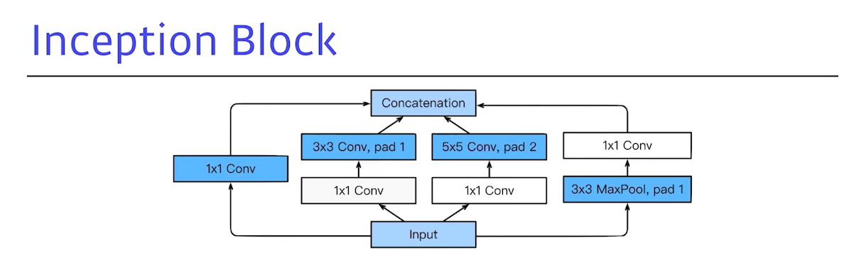 inception Block 을 보면 3x3 혹은 3x3 layer를 사용하기 전에 1x1 conv 를 추가한다. 입력이 128 채널, 출력이 128채널인 이미지를 예로 들어보자. 3x3 convolution 연산을 하게 되면 3x3x128x128 =147, 456 개의 parameter 수를 가진다. 하지만 그 사이에 1x1 convolution 연산을 통해 32채널로 축소시키는 연산을 하면 1x1x128x32 + 3x3x32x128 = 40,960개로 parameter수가 급격하게 감소하는 것을 확인할 수 있다.