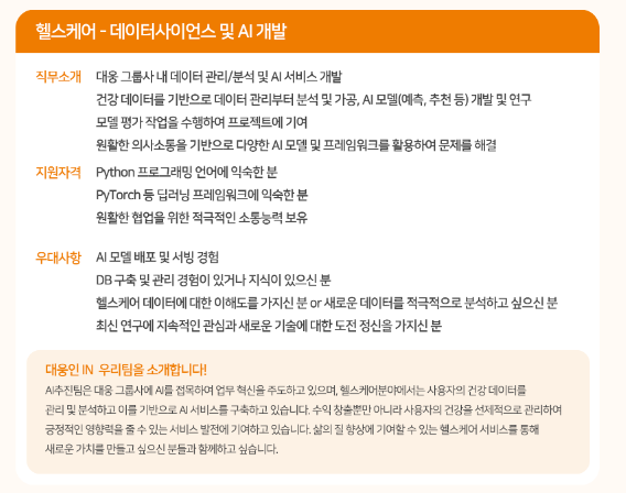 채용 분야는 LLM, 생성형 모델(Vision), 헬스케어 AI개발, AI 리터러시 교육, 백엔드 등의 직군이 있었는데, 나는 헬스케어 AI 개발 직무에 지원하였다.