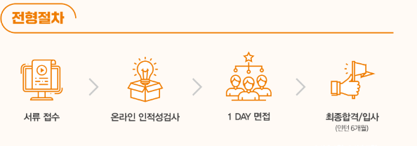 전형 절차는 서류 전형 -> 온라인 인적성 검사 -> 1 Day 면접 -> 최종 입사(6개월 인턴) 로 구성되어 있다. 인턴을 채용하는 만큼 매우 간소화된 프로세스로 이루어져 있고, 최종 합격한 후 우수 인턴 사원에 한하여 정규직 입사 기회를 제공한다고 한다. 아무래도 프로세스가 간단하다 보니 인턴을 6개월이나 진행하는 것 같다.