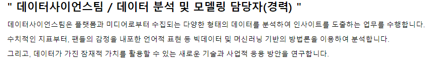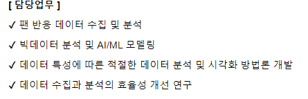 최근 이곳 저곳 다양한 회사에 지원서를 넣으면서 YG 엔터테인먼트에서도 데이터사이언스 관련 직무를 채용하는 것을 발견했다. "팬들의 감정을 내포한 언어적 표현" 으로 된 것으로 보아 감성분석 모델링이나, 예측 모델 등을 다루고 시각화 대시보드를 중점적으로 다루는 업무로 보인다.