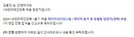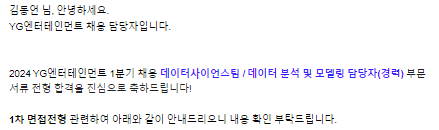 임원 면접 이후, YG 사에서 연락이 왔다. 연봉 및 처우 협의를 진행하는 과정에서 조율이 되지 않아 최종적으로는 갈 수 없게 되었다.