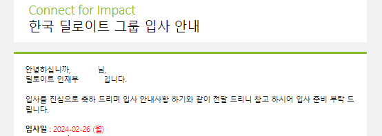 딜로이트는 01.24 ~ 01.30 까지 지원서를 받고 있다. 그런데, 01.29 일에 서류 합격 결과가 나왔다. 채용 과정에서 마음에 드는 사람이 있는 경우 미리 채용을 마감하는 경우가 있는데, 이번에 뽑으려고 하는 인재상에 적절하다 생각해서 아마 미리 채용 프로세스를 진행한 것이지 않을까 라는 생각이 든다. 기분 좋은 출발이다.