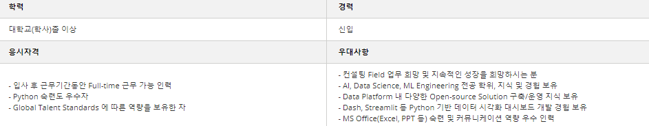 우대사항을 보면, Dash, Streamlit 등 Python 기반 데이터 시각화 대시보드 구현 경험을 우대하는 것을 보아, 아무래도 컨설팅 회사다 보니 너무 기술적인 접근 보다는 대시보드 개발을 통한 분석 결과를 제공하는 형태의 컨설팅이지 않을까 싶다.