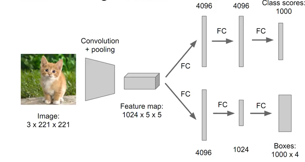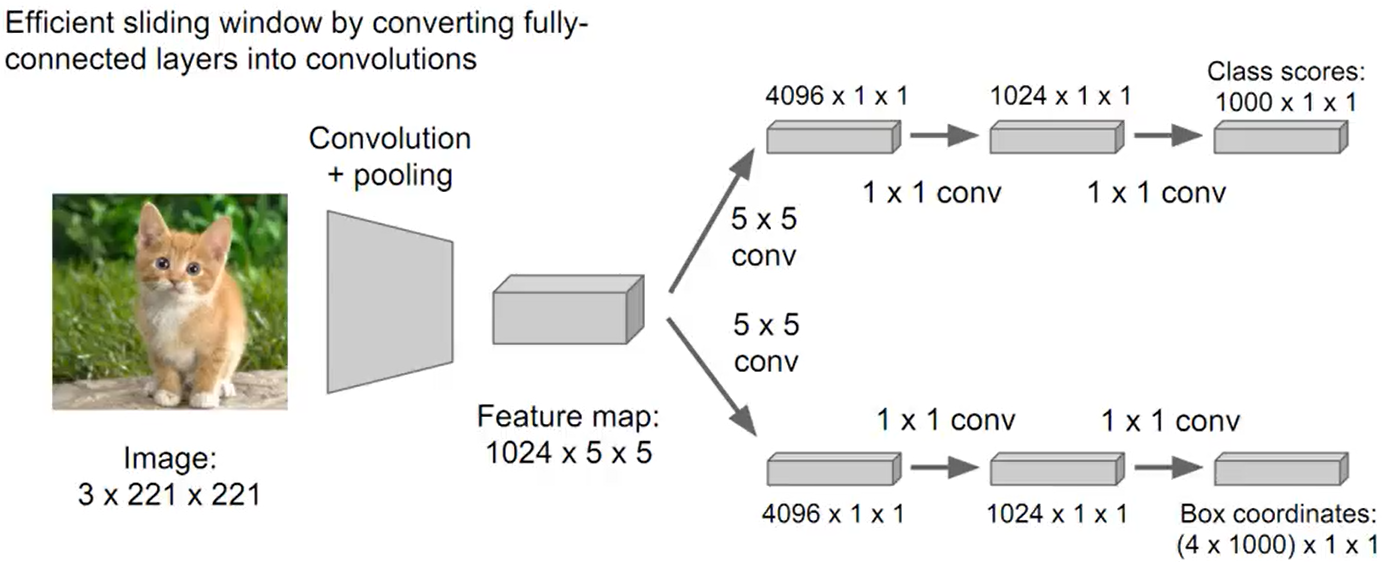 기존의 localization regression 방법에서는 CNN 뒤에 fully-connected layer를 사용했다. 그와는 다르게 Overfeat에서는 fully-connected layer대신에 1 by 1 convolution layer를 사용했다. conv layer 부분은 영상의 크기와는 상관없이 적용이 가능하지만 fully-connected layer부분은 고정된 size를 가지고 있어서 conv 앞 단에서 fixed size를 고려해야하는 동일한 크기으 feature map이 확보되어야하는 단점이 있었다. 이 문제를 1 by 1 convolution으로 해결할 수 있다.