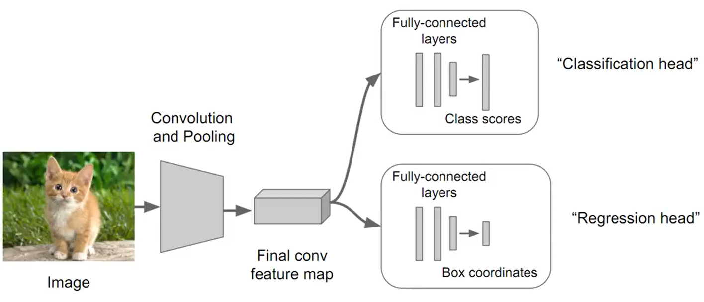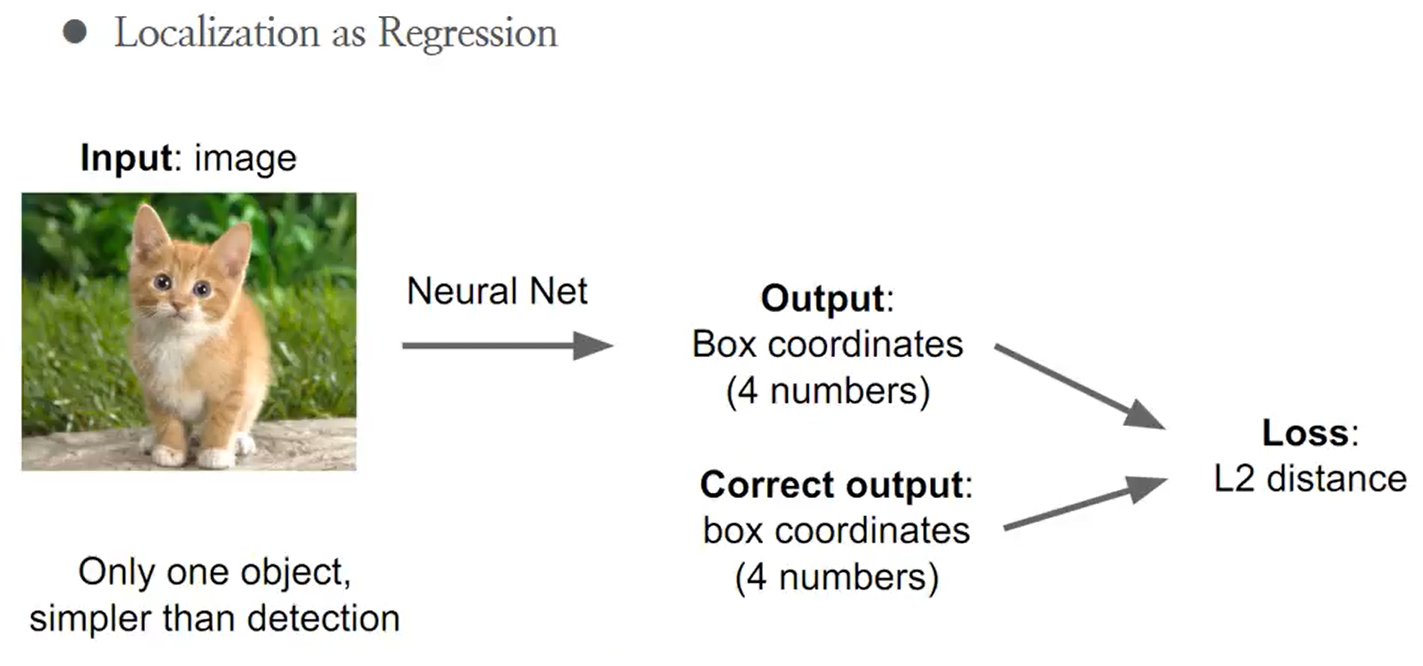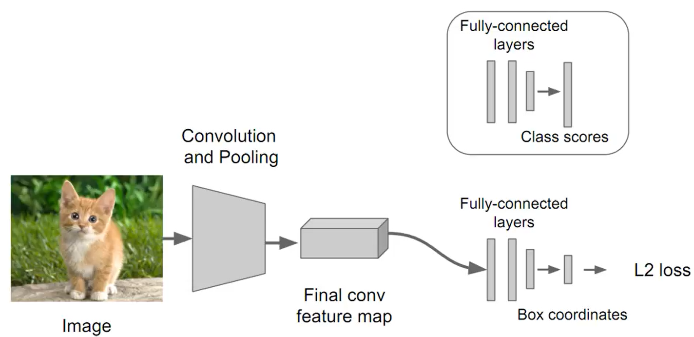 이미지가 주어졌을 때 신경망을 이용해 Box coordinates를 예측하고 실제 box coordinates 값과 비교를 할 때 위치 좌표는 regression problem 이므로 loss function으로 L2 distance를 사용하게 된다.