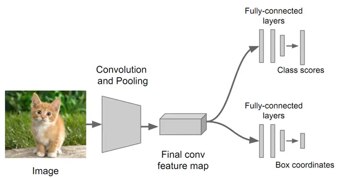 Classification은 이미지가 주어졌을 때 class label이 결과값으로 출력되고 이를 정확도로 평가할 수 있다. Localization은 이미지가 주어졌을 때 해당 물체의 바운딩 박스 자체가 결과값으로 출력된다. x,y는 물체 왼쪽 상단의 좌표이고 넓이(width)와 높이(height)로 나타낸다. ($x,y,w,h$) 평가 척도는 Intersection over Union이라는 것을 사용한다.